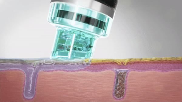 La technologie brevetée Vortex-Fusion® d'Hydrafacial utilise une aspiration à vide réglable en fonction de l’épaisseur et de la sensibilité de la peau pour ouvrir les pores et éliminer les points noirs et les comédons.